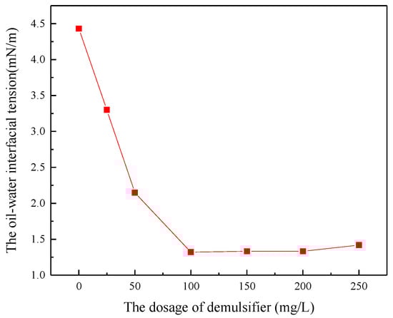 The simulated ASP flooding produced water with 400 mg/L of the polymer concentration, 200 mg/L of the surfactant concentration and 800 mg/L of the NaOH concentration was prepared and settled in a 45 °C water bath for 4 h to study the effect on oil-water interfacial tension in Figure 1. For the emulsion of ASP flooding produced water without adding a demulsifier, the effect of NaOH on interfacial tension of the system was mainly achieved by the surface-active components formed by the reaction with the acidic components and it had no obvious influence by itself on the interfacial tension. Surfactants had a great influence on the interfacial tension of the system, while the polymer had no effect on the interfacial tension. After adding the demulsifier, it can be observed that the demulsifier can reduce the oil-water interfacial tension. When the dosage of demulsifier increased from 0 to 100 mg/L, the interfacial tension of oil-water decreased from 4.425 mN/m to 1.325 mN/m, and then stabilized even with further addition from 100 mg/L to 200 mg/L. When the dosage exceeded 200 mg/L, the interfacial tension began to increase gradually. This is due to the fact that the very active demulsifier molecules can adsorb to the oil-water interface, thus reducing the oil-water interfacial tension. The adsorption of demulsifier molecules on the oil-water interface increased gradually with the increasing dosage of demulsifier. When the concentration reached 100 mg/L, the adsorption of demulsifier molecules on the interface reached saturation. Therefore, the oil-water interfacial tension decreased in concentration when the concentration of demulsifier further increased. Then, when the concentration of the demulsifier was higher than its critical micelle concentration (CMC), the demulsifier molecules began to aggregate into clusters to form micelles which caused the oil-water interfacial tension. In this case, the effect of demulsification and stabilization was reduced.