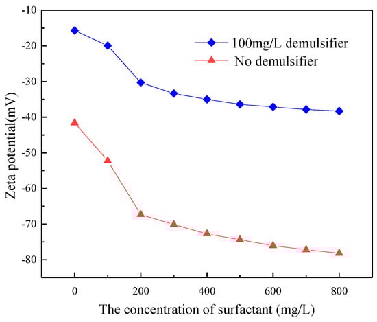 The simulated ASP system with 400 mg/L of the polymer, 800 mg/L of NaOH concentration and 0~600 mg/L of the surfactant concentrations were prepared. Then, 100 mg/L of demulsifier ZY was added into the produced water. The ASP system was settled in a 45 °C water bath for 4 h to study the effect of the demulsifier on the Zeta of potential surfactants with different concentrations, as shown in Figure 2. For the emulsion of ASP flooding produced water without adding demulsifier, the surfactants were absorbed onto the oil droplets with its non-polar head and polar head group extending in water. The Zeta potential on the surface of the oil droplet decreases quickly because the negative charges on the surface of the oil droplet increased. NaOH reacted with acidic components of crude oil and produced some surface-active components which adsorbed on the surface of oil droplets to reduce the Zeta potential. With increasing NaOH, the acid components were reacted completely. The electric double layer was compressed by the Na+ at the oil-water interface, resulting in the Zeta potential increasing on the surface of the oil droplet. The Zeta potential increased as a result of the above two combined effects. The polymer had a limited effect on the Zeta potential and stability of the system because of its low surface activity. After adding demulsifier, the surfactant can significantly improve the stability of the system. A higher concentration of the surfactant results in better stability of the system [32,33]. Compared to the system with no demulsifier, with 100 mg/L of demulsifier the absolute value of the Zeta potential on the surface of oil droplets decreased significantly at the same surfactant concentration and the stability of the system was changed from stable to unstable. The Zeta potential of the oil droplets changed from −41.234 mV to −15.547 mV because the 100 mg/L of demulsifier was added when the surfactant concentration is 0. The Zeta potential of the oil droplet was 62.3%. The Zeta potential of the oil droplet was changed from −67.125 mV to −30.625 mV when 100 mg/L of demulsifier was added to 200 mg/L of the surfactant solution. The absolute value of the Zeta potential of the oil droplet changed from 54.9% to 51.8% when the concentration of surfactant increased to 400 mg/L, while the absolute value of Zeta potential was stabilized with increasing surfactant concentration. The effect of demulsifier on the Zeta potential of oil droplets decreases gradually with increasing surfactant concentration.