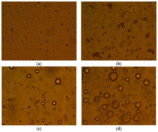 The effect of demulsifier on the size of oil droplets. (a) Settlement without demulsifier for 0 min, (b) settlement without demulsifier for 120 min, (c) settlement with demulsifier for 0 min, (d) settlement with demulsifier for 120 min.