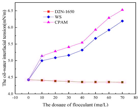 The simulated ASP flooding produced water with 400 mg/L of polymer, 200 mg/L of surfactant concentration and 800 mg/L of NaOH concentration was prepared and settled in a water bath temperature of 45 °C for 4 h to study the effect of flocculant WS on oil-water interfacial tension. The effects of CPAM and D2N-1650 on oil-water interfacial tension were studied respectively under the same experimental conditions, as shown in Figure 5. The flocculant WS can increase the oil-water interfacial tension. When the concentration of flocculant increased from 0 to 70 mg/L, the interfacial tension of oil-water increased from 4.425 mN/m to 6.153 mN/m. The flocculant WS can only slightly increase oil-water interfacial tension, and its ability to do so is a result of the CPAM in the flocculant WS. With increasing concentration of the flocculant WS, the concentration of polyacrylamide in the system increased. Therefore, the viscosity of the system increased and the transportation and adsorption of surfactant on the oil-water interface was influenced. Thus, the amount of surfactant reaching the oil-water interface decreased, resulting in an increase in oil-water interfacial tension. However, the hindrance was weak, so the increase of oil-water interfacial tension was limited. The flocculant CPAM had no effect on the oil-water interfacial tension [34]. Compared to flocculant D2N-1650, the flocculent CPAM played a larger role in reducing the oil-water interfacial tension. Finally, the concentration of flocculant WS can increase the oil-water interfacial tension.