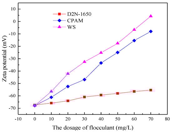 The simulated ASP flooding produced water with 400 mg/L of polymer, 800 mg/L of NaOH and 200 mg/L of the surfactant was prepared. The flocculant WS was added into the produced water and both were settled in a water bath at a temperature of 45 °C for 4 h to study the effect of the flocculant on Zeta potential for the ASP flooding produced water. The effects of CPAM and D2N-1650 on Zeta potential were studied respectively under the same experimental conditions, as shown in Figure 6. The flocculant CPAM and D2N-1650 can reduce the absolute value of the Zeta potential individually, however the interaction of the two flocculants can reduce the absolute value of Zeta potential even further. A large number of positive charges on the molecular chain from the flocculant CPAM neutralized the negative charge on the surface of the oil droplet. Then the absolute value of Zeta potential on the droplet surface decreased greatly. The flocculant D2N-1650 did not have positive charges. It can only bind the oil droplets together to produce precipitation through “adsorption bridging”. Therefore, the influence of the flocculant D2N-1650 on the Zeta potential was limited.