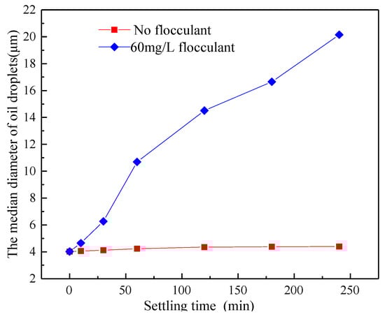 The simulated ASP flooding produced water with 400 mg/L of polymer, 800 mg/L of NaOH and 200 mg/L of the surfactant was prepared. Then, 60 mg/L flocculant WS was added into the produced water and settled in a 45 °C water bath for 2 h to study the effect of flocculant on oil droplet median diameter, as shown in Figure 7 and Figure 8. The magnification used to produce Figure 8 was 10 × 40. There is an obvious effect of the flocculant increasing the median diameter of oil droplets. The median diameter of oil droplets increased when settled for 2 h without flocculant. The limited increase indicated that the ASP flooding produced water was very stable. However, the median diameter of oil droplets increased from 4.02 μm to 20.15 μm when settled for 2 h with added flocculant into the system. The significant increase of the median diameter of oil droplets indicated that the oil droplets in the ASP flooding produced water had become unstable after adding flocculant. However, when compared with adding demulsifier ZY, the effect of flocculant WS was relatively small. In order to further investigate the effect of demulsifier on the size of oil droplets, the shapes of oil droplets in the simulated produced water at different conditions were studied with a microscope, the results of which are shown in Figure 8. The size of oil droplets in the simulated produced water without flocculant was basically unchanged after settlement for 2 h. The size of oil droplets increased significantly after adding flocculant for settlement for 60 min. With an increase in settling time, the size of oil droplets increased gradually.