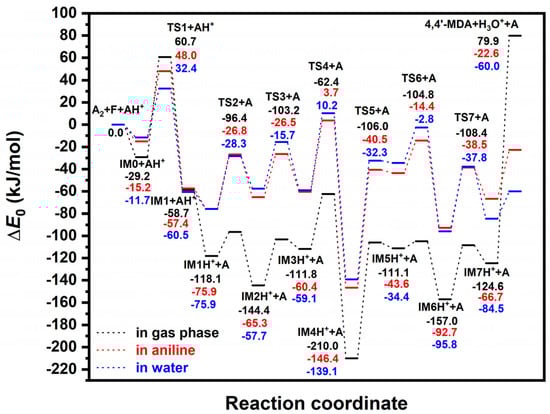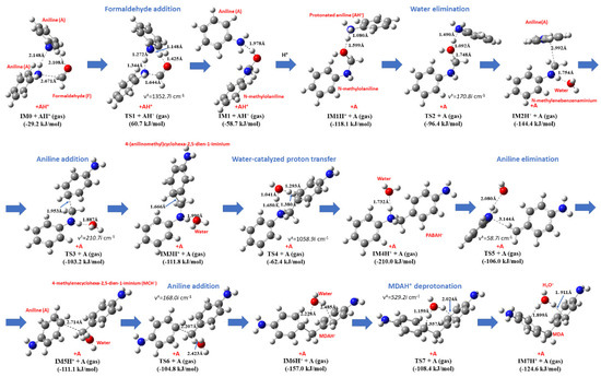 The presence of solvents (aniline and water) changes significantly energy profile of the reaction as shown in Figure 2, the solvent effect is very similar regardless which solvent is considered. The most dramatic change is the stabilization of the final product (see 4,4′-MDA+H3O++A in Table 1) by 102.5 kJ/mol for aniline solution and by 139.9 kJ/mol for aqueous solution which is mainly due to the solvation energy difference between protonated aniline (AH+) and hydronium cation (H3O+). The highest lying barrier in gas phase, that is TS1, is also decreased due to solvation by 12.7 kJ/mol (in aniline) and 28.3 kJ/mol (in water). While its pre-reaction (IM0 + AH+) and post-reaction (IM1 + AH+) complexes are destabilized slightly (14.0 kJ/mol and 1.3 kJ/mol in aniline, respectively), large destabilization effect can be observed for the intermediates and transition states after the protonation of IM1 intermediates (IMx and TSx, where 2 ≤ x), its magnitude is in the range of 42.2–90.5 kJ/mol for the aniline solution, while it is 40.1–102.1 kJ/mol for the aqueous solution (about 60 kJ/mol in average). The largest increase in relative energy belongs to the transition state of the second aniline addition (TS6) for both solutions, this energy shift was 90.5 kJ/mol and 102.1 kJ/mol for aniline and for aqueous solution, respectively. Similarly, the transition state for first aniline addition (TS3) and its pre-complex (IM2H+) are also significantly destabilized by solvation compared to the other TSs and intermediates (in the range of 76.8–87.5 kJ/mol). Structural changes according to solvent effect are shown in the Supplementary Materials (see Figure S1 and Figure S2 in for aqueous and aniline solution, respectively).