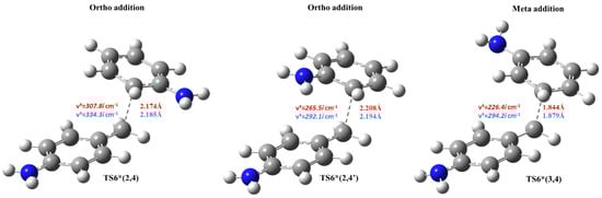 From both thermodynamic and kinetic points of view, aniline addition to ortho position (2,4) is at least as preferred as the para position (4,4) due to the low activation energy and energy release. In contrast, the meta addition (3,4) is endothermic with high activation barrier in both condensed phases. More interestingly, one of the ortho addition steps has submerged transition state (−1.9 kJ/mol in aqueous phase) due to the strong ion-dipole interaction manifested in the vicinity (2.2 Å) of amine group of A and benzene ring of MCH+ as shown in Figure 4.