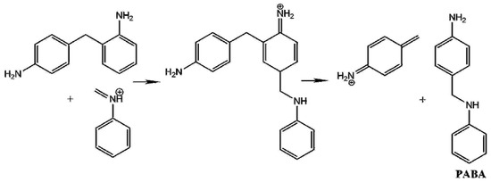 Based on these results, significant amount of 2,4-MDA should be formed as a product of the title reaction which is in clear contradiction with laboratory observations (more than 92 w/w% of the product is 4,4′-MDA while 7 w/w% is 2,4′-MDA [46]). This contradiction might be caused by incomplete quantum chemical description of the solvent effect and/or neglecting the role of the counter ion in the mechanism. On the other hand, 33.5 w/w% of the product is oligomeric and polymeric MDA [46]. Another hypothesis might be that the 2,4′-MDA is more reactive towards further aniline addition making oligomeric structures (e.g., 3-ring) overrepresented in these forms. To bear in mind that the above mentioned experiments are on the several minutes time scale, that makes reactive interferences between the intermediates and products possible (the w% of 4,4′-MDA became saturated at 20% after ca. 40 min in Knjasev experiment at T = 70 °C, where the initial molar ratio of the mixture was A:F:HCl:H2O = 4:2:1:13 [45]). An example for such interference is the highly preferred addition of the N-methylenebenzeneaminium (the ‘3-ring’ structure) in the para position which is also supported by the 2H- and 13C-NMR-based observation by Knjasev [45]. This step can be followed by proton transfer which might make the dissociation of the adduct favorable to MCH+ and PABA as it shown in Figure 5.