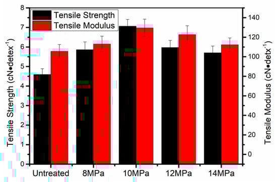 3.1. Mechanical Properties of PAN Fibers Treated at Different Pressures