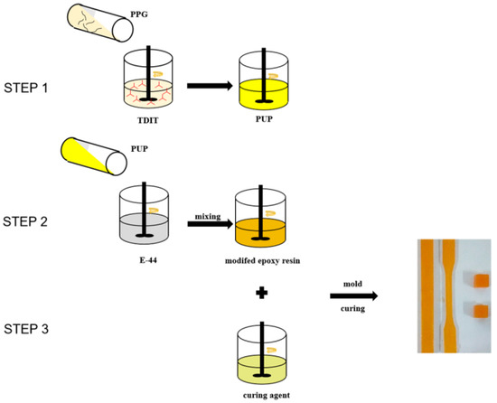 Ether of bisphenol A type EP (E-44) and low-molecular-weight polyamide were supplied by Baling Petrochemical Co., Ltd. (Hunan, China). TDIT and Allyl glycidyl ethers (AGE) were purchased from Jining Huakai Resin Co., Ltd. (Jining, China). Polypropylene glycol (PPG 1000) was purchased from Qingdao Chemical Science and Technology Co., Ltd. (Qingdao, China). 2,4,6-tris (dimethylaminomethyl) phenol (DMP-30) and 1,4-butanediol were provided by Chinese Medicine Group Chemical Reagent Co., Ltd. (Beijing, China).