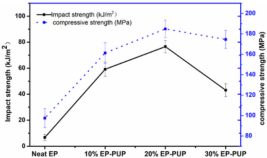 The effect of the amount of prepolymer on the compressive and impact properties of the specimens is shown in Figure 3. It can be seen that the impact property first increased and then decreased with increasing prepolymer content. When the amount of prepolymer added to the epoxy resin was 20%, the material showed the best state of compressive and impact resistance. The value of impact performance was 76.6 kJ/m2, which is better than the 9.25 kJ/m2 in Park’s study and the 17.63 kJ/m2 in Hai-an Xie’s study [34,35]. Compared with that reported in other people’s research, the performance of the pressure resistance is greatly improved [36]. The results are in agreement with those shown in Figure 2. This is also mainly due to the addition of the flexible segments of prepolymer grafted onto the epoxy resin chain. As a result, the prepolymer was interspersed in the epoxy resin system and intertwined with the epoxy chain to form an interpenetrating network structure, thus changing the brittleness of the epoxy resin [37]. When the material is subjected to stress, the structure of the network can disperse the stress and the flexible chain can help to maintain a higher elongation at break. The compressive properties were also increased, which may be due to the advantages of the rigidity of the isocyanurate six-member ring in the trimer and the structure of the network. When the amount of prepolymer is too large, some of the prepolymer fails to produce a timely graft reaction; this results in self-polymerization, and the polymerization of the prepolymer exists in the form of small, isolated phases in the solidified compound. Furthermore, the compatibility between PUP and EP becomes worse, leading to a decline in mechanical properties. The results show that the modified epoxy resin has the best performance when the prepolymer content is 20%.