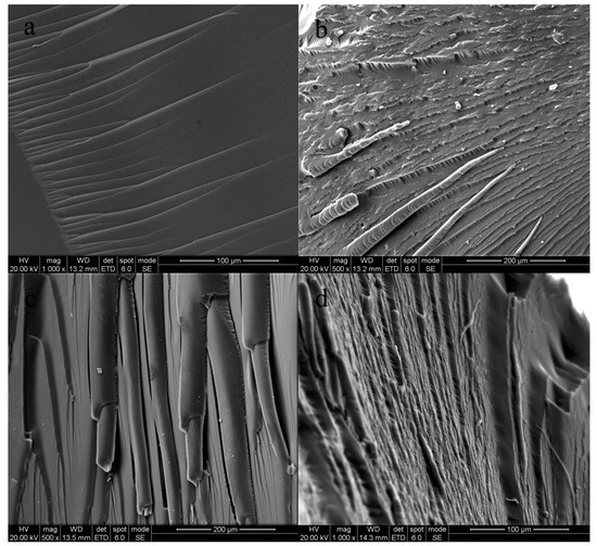 The SEM images of the impact fracture surfaces of the cured products are shown in Figure 4. It can be observed in Figure 4a that the impact fracture surface of the pure EP is orderly, uniform, and smooth, showing a typical brittle fracture morphology [38]. This indicates that the pure epoxy resin only has low resistance to crack growth, and its ability to resist crack expansion is very weak. Thus, the crack grows rapidly, and brittle fracture occurs. In Figure 4b, it can be seen that the grain of the fracture surface expands along the direction of impact force. There are some chain segments with a thick end and a thin end, which may be the modified EP, and a smooth and uniform fracture surface can also be seen, which may be the pure EP. Brittle fracture and ductile fracture are also shown in the impact fracture surface. In Figure 4d, the stripping surface between two phases can be seen; this may be superfluous prepolymer PUP forming a small, isolated phase through self-polymerization. Thus, an interface is formed between PUP and the modified EP, giving poor compatibility. Meanwhile, in Figure 4c, uniform fibers and the typical flexible fracture surface can be seen, which means that a complete network was formed [39]. This may be the reason for the results shown in Figure 2 and Figure 3.