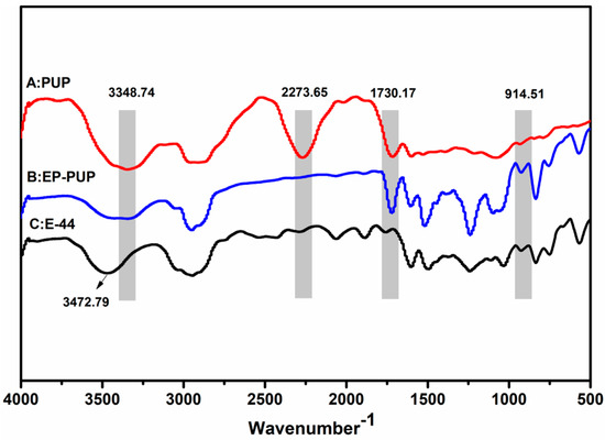 FTIR spectra of the polyurethane prepolymer (A), modified epoxy (B), and neat epoxy E-44 (C).