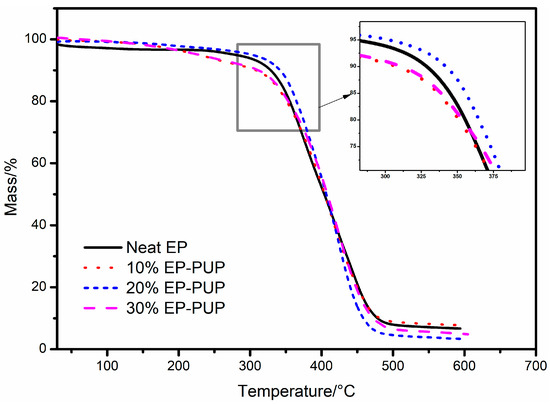 Figure 6 shows the TG curves of cured neat EP and EP-PUP samples investigated under Ar atmospheres, and the corresponding data are listed in Table 2. The change in the general trend of the TG curve shows that the thermal decomposition mechanisms of E-44 epoxy resin and EP-PUP are basically the same. As Figure 6 shows, the thermal decomposition of solidified EP-PUP compounds is basically divided into three stages. The first stage is when the decomposition temperature ranges from 0 to 310 °C and is mainly the volatilization of the remaining oligomer and residual moisture in the modified epoxy resin. The second stage (310~480 °C) is mainly caused by the elimination reaction of the terminal groups (hydroxyl groups, amino groups) of the modified epoxy resin cured structure. In the third stage, the thermogravimetric loss at 480 °C is reduced obviously, which is caused by the degradation of the main chain of the epoxy resin.