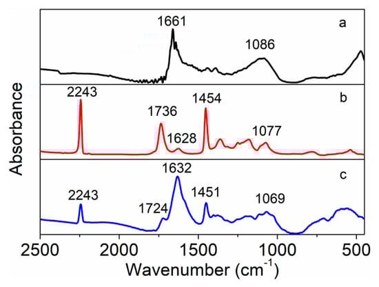The FTIR spectra of amino-MWCNTs, PAN polymer and PAN grafted amino-MWCNT nanocomposites are shown in Figure 2. The FTIR spectrum of amino-MWCNTs, as can be seen in Figure 2a, showed a very strong absorption peak at 1661 cm−1, which is assigned to the stretching vibration of amide carbonyl groups, and the band at 1086 cm−1 is attributed to the stretching vibration of the C–N bond. These results are consistent with previous reports [22,23], indicating that the amino groups are grafted onto the surface of MWCNTs. The FTIR spectrum of the control PAN polymer showed a very strong absorption peak at about 2243 cm−1, which is attributed to the nitrile group vibration, and the peak at 1736 cm−1 corresponds to the carboxylic acid groups of IA on the PAN macromolecular chains [24]. The peaks at 1454 and 1077 cm−1 are assigned to the bending vibration of C–H groups. The weak peak at 1628 cm−1 belongs to the NH2 bending that was likely caused by the hydrolysis of nitrile groups [25]. For the PAN grafted amino-MWCNT nanocomposites, the peak of the carboxylic acid group shifted from 1736 to 1724 cm−1, and the peak of C–H bending vibration shifted from 1454 to 1451 cm−1 and from 1077 to 1069 cm−1, respectively. Moreover, the strong peak of amino-MWCNTs shifted from 1661 to 1632 cm−1 of the PAN grafted amino-MWCNT nanocomposites. The results coming from these shifted peaks suggest that the amino-functionalized groups on the surface of MWCNTs reacted with the carboxylic acid groups on the control PAN macromolecule chains, and a chemical bond was formed between them.