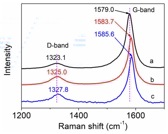Raman spectroscopy was used to characterize the structural changes of the surface of MWCNTs, and the interfacial interaction between the MWCNTs and polymer matrix according to the shift of peaks about MWCNTs. The purified MWCNTs, as shown in Figure 3a, had two significant peaks. The strong peak at about 1579.0 cm−1 (G-band) is assigned to the sp2 graphite carbon of the MWCNTs, and the broad weak peak at about 1323.1 cm−1 (D-band) is attributed to the sp3 hybridized carbon of the MWCNTs [26]. After being modified by amino-functionalized groups, as shown in Figure 3b, the amino-MWCNTs also had two typical peaks. However, the peaks about the G-band and D-band shifted from 1579.0 to 1583.7 cm−1 and from 1323.1 to 1325.0 cm−1, respectively. Compared with the amino-MWCNTs, the peak of the G-band for the PAN grafted amino-MWCNT nanocomposites shifted from 1583.7 to 1585.6 cm−1, and the peak of the D-band shifted from 1325.0 to 1327.8 cm−1. These results indicate that a strong chemical interfacial interaction exists between the PAN and the amino-MWCNTs after in situ polymerization [27]. The value of the G-band/D-band intensity ratio (IG/ID) was used to characterize the surface structure of MWCNTs. The value of IG/ID for amino-MWCNTs is 5.98, which is lower than that of purified MWCNTs at 9.84. This suggests that the surface of the amino-MWCNTs has more relative content of sp3 hybridized carbon than the purified MWCNTs owing to grafting of the amino-functionalized groups. However, the value of IG/ID for the PAN grafted amino-MWCNT nanocomposites is 4.87, indicating that the relative number of sp3 hybridized carbon attaching onto the amino-MWCNTs increased after AN polymerization [28]. Thus, the Raman results suggest that the PAN polymer covalently attached to the surface of the amino-MWCNTs.