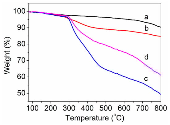 The relative amount of the grafted PAN can be calculated by TG curves through thermal decomposition. The TG curves of purified MWCNTs, amino-MWCNTs, the PAN polymer and the PAN grafted amino-MWCNT nanocomposites in a nitrogen atmosphere are shown in Figure 4. As can be seen in Figure 4a, the weight loss of purified MWCNTs was 9.6% at 800 °C. For the amino-MWCNTs, as shown in Figure 4b, rapid weight loss occurred between 250 and 400 °C, which is ascribed to some functional groups on the surface of MWCNTs. The weight loss of the amino-MWCNTs at 800 °C was 15.2%, which is larger than that of purified MWCNTs. The PAN polymer had similar weight loss to PAN grafted amino-MWCNTs at lower temperatures between 80 and 300 °C, as shown in Figure 4c,d, which is attributed to the loss of the residual water and small molecules. At a temperature above 300 °C, the PAN polymer begun to lose weight quickly up to 470 °C, and then the rate of weight loss slowed down. During this process, the PAN polymer underwent a cyclized reaction, dehydrogenation reaction and oxidative reaction to form a ring structure. The weight loss for the PAN polymer at 800 °C was 50.5%. However, the rate of weight loss for the PAN grafted amino-MWCNTs was lower than that of the PAN polymer for a temperature from 300 to 470 °C, and had the same parallel line as the PAN polymer between 470 and 800 °C. The weight loss of the PAN grafted amino-MWCNTs was 38.9% at 800 °C. The higher residual weight suggests that the amino-MNCNTs changed the complex chemical reaction and promoted formation of a more stable ring structure because of the interfacial interaction between them [29], which was beneficial for obtaining a high yield of the carbon materials. According to the weight loss at 800 °C for the amino-MWCNTs, PAN polymer and PAN grafted amino-MWCNTs, the content of grafted PAN on the surface of amino-MWCNTs was about 73.2%.