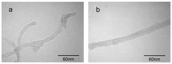 To confirm the PAN polymer grafted onto the surface of the amino-MWCNTs, the TEM images of amino-MWCNTs and the PAN grafted amino-MWCNTs nanocomposites are shown in Figure 5. The amino-MWCNTs, having a smooth surface, are individually dispersed with a diameter of about 10 nm, as shown in Figure 5a, and have a hollow structure with an internal diameter of about 5 nm. However, the PAN grafted amino-MWCNTs, as can be seen in Figure 5b, exhibit a non-hollow structure owing to the grafted PAN polymer layer, with a diameter of about 20–25 nm and a rough surface. These results suggest that the PAN polymer was grafted onto the surface of the amino-MWCNTs by in situ polymerization.