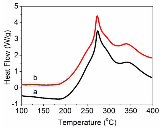 DSC curves of (a) the PAN nascent fibers and (b) the grafted MWCNT/PAN nascent composite fibers.