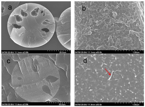 Figure 8 shows the cross-sectional structure of the PAN nascent fibers and the grafted MWCNT/PAN nascent composite fibers. The cross-sectional structure of the PAN nascent fibers in Figure 8a shows some porous structures between the skin and core, which is attributed to the exchange of water and DMSO solvent when the spinning solution passes through the spinneret holes and spins into the coagulation bath. Furthermore, there are some nanopores on the cross-sectional morphology in Figure 8b. However, the addition of grafted MWCNTs into the PAN matrix reduces the number of porous structures and nanopores in the grafted MWCNT/PAN composite fibers, as shown in Figure 8c,d. Especially as shown by the arrow in Figure 8d, the individual grafted MWCNTs with a diameter about 20 nm was exhibited in the cross-section of the nascent composite fibers. Moreover, the morphology of cross-section for the PAN nascent fibers shows a lamellar structure in Figure 8b. However, the composite fibers in Figure 8d exhibit some wire drawing on the cross-section owing to the PAN macromolecular chains. These structures indicate that the grafted MWCNT/PAN nascent composite fibers have better tensile properties than the PAN nascent fibers. Meanwhile, a less porous structure means higher compactness, and higher compactness suggests that the nascent fibers have higher mechanical properties, as shown in Table 3. The addition of the grafted MWCNTs increases the tensile strength from 3.83 to 4.37 cN/dtex and the tensile modulus from 101.73 to 121.82 cN/dtex, and decreases the breaking elongation from 50.63% to 32.68%, respectively. Moreover, this porous structure would continue to be retained in the PAN precursor fibers through the drawing process, which reduced the tensile strength of the final carbon fibers. Therefore, the grafted MWCNT/PAN nascent composite fibers would achieve high performance carbon fibers compared with the PAN nascent fibers.