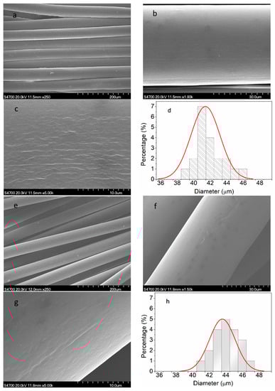 SEM images of surface morphology and corresponding diameter distribution: (a–d) the PAN nascent fibers and (e–h) the grafted MWCNT/PAN nascent composite fibers.