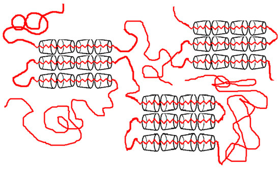 When an excess of guest polymers is used to form inclusion compounds with host cyclodextrins (CDs), non-stoichiometric polymer–CD inclusion compounds (ICs) [(n-s) polymer–CD ICs] can result [1,2,3,4,5] and are depicted schematically in Figure 1. The unthreaded polymer chain portions in (n-s) polymer–CD ICs are then free to associate with each other and potentially crystalize. At the same time, the threaded chain portions covered with host CDs can crystallize in the same crystal structures assumed by stoichiometric polymer–CD ICs, with fully covered threaded guest polymer chains.