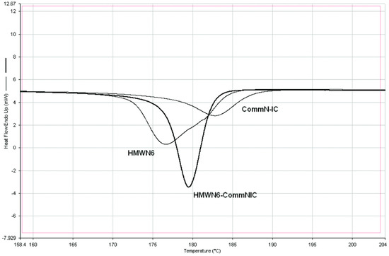 Crystallization on cooling (10 °C/min) melts of neat nylon-6 (HMWN6), 3:1 (n-s) nylon-6–α–CD IC (CommN-IC), and nylon-6 with 2 wt % of 3:1 (n-s) nylon-6–α–CD IC (HMWN6-CommNIC). In each case, nylon-6 with MW = 60,000 was employed, reproduced from [8] with permission, copyright American Chemical Society, 2009.