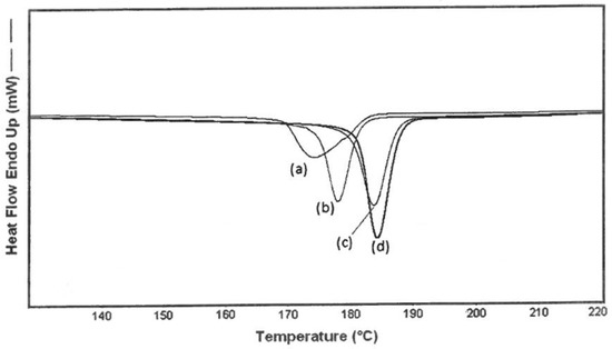 DSC cooling scans for (a) neat nylon-6 sample (600,000 g/mol), with 2 wt % of (b) nylon-6 coalesced from the 1:1 fully threaded nylon-6–α–CD IC, (c) nylon-6 coalesced from 3:1 (n-s) nylon-6–α–CD IC, and (d) nylon-6 with 2 wt % talc. Reproduced from [6] with permission, copyright Elsevier, 2009.