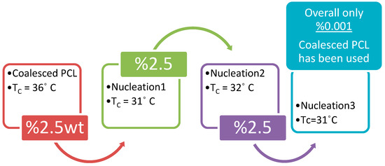 Repeated nucleation of the melt crystallization of poly (ε-caprolactone) (PCL) using coalesced PCL initially, followed by the repeated use of nucleated PCL to nucleate the melt crystallization of fresh bulk PCL. It should be noted that neat bulk PCL crystallizes at ~11 °C at the same DSC cooling rate of 20 °C/min.