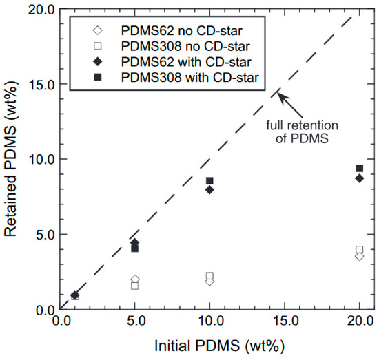 Retained poly(dimethyl-siloxane) (PDMS) (MWs = 62,000 and 308,000) vs. initial PDMS content for solution-cast films with and without γ–CD-stars. Films containing γ–CD-stars have a γ–CD core concentration of 1.0 wt %. Reproduced from [14] with permission, copyright Elsevier, 2010.