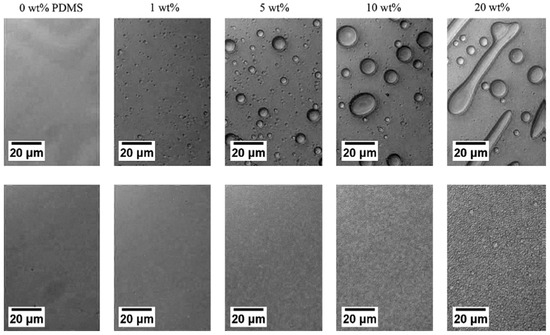 Reflection optical micrographs of PS/PDMS (MW = 62,000) spun-cast films with varying amounts of PDMS. Top row: blends without CD-star; Bottom row: blends containing CD-star at 1 wt % CD core. Reproduced from [14] with permission, copyright Elsevier, 2010.