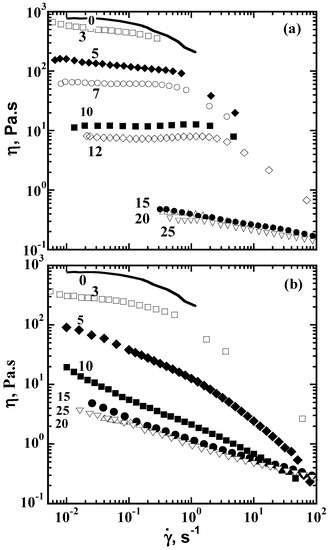 Effects of addition of (a) α-CD and (b) β-CD on the steady shear viscosity of 3% HASE associative polymer solutions. Numbers correspond to the moles of cyclodextrin per moles of hydrophobe. Reproduced from [15] with permission, copyright John Wiley & Sons, 2013.
