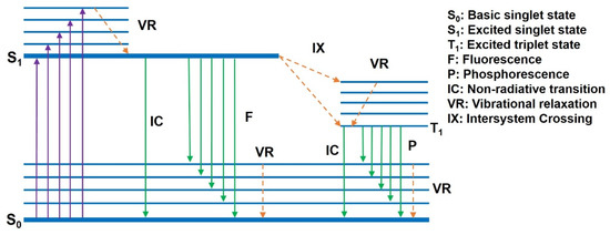 The ground state refers to the stable state of a molecule in photophysics and photochemistry—that is, the lowest state of energy. When electrons in a molecule are excited, the molecule is in the excited state, which is an unstable state with relatively high energy. After absorbing the energy from the external excitation, the electrons jump to the excited state from the ground state, and the luminescence of conjugated polymer materials is the radiation that is generated from the electrons’ return to the ground state from the excited state. Electrons exist in pairs in each molecular orbital in the ground state. According to the Pauli exclusion principle, two electrons in the same orbital have opposite spin, so when the total electron spin in a molecule is zero the molecule is in the ground state (S0). When an electron in a molecule is stimulated after absorbing energy, often its spin is unchanged, so the molecule is in the excited singlet state (S). If the electron spin is reversed during excitation, the molecule is in the excited triple state (T). When the molecules of the conjugated polymers are excited from the ground state S0 to the excited state S under external excitation, and then relaxed to the lowest level of excitation (that is, the singlet state S1) due to the level of vibration, the vibration relaxation process is around 10−l4 s~10−12 s. Finally, the electrons transit back to the ground state S0 from S1, and thus they radiate photons. The S1→S0 process is called the fluorescence, and the time required for fluorescence radiation transition of the excited singlet state is commonly 10−8 s [1]. It is also possible that when the energy of the excited state is close to the ground state, the electrons can pass through the barrier between them in a tunneling effect. Thereafter, the molecule is in a highly excited vibrational energy level of the ground state—this process is commonly referred to as an “internal conversion”. Internal conversions, which are competitive with fluorescence radiation, are generally particularly fast (within 10−11 s). The above discussion concerns the process of fluorescence radiation. If the electron passes from the lowest excited singlet state S1 to the lowest excited triplet state T1 by intersystem crossing, and then emits a photon when it returns from T1 to S0, it is called phosphorescence [36,37]. The transition rate of the phosphorescence process is much smaller than that of the fluorescence process due to the fact that the phosphorescence process is a transition involving the change of spin multiplicities and it is limited by the spin factor. The corresponding phosphorescence life is relatively long, generally within the order of milliseconds or even reaching the order of seconds. The specific process is shown in Figure 2.