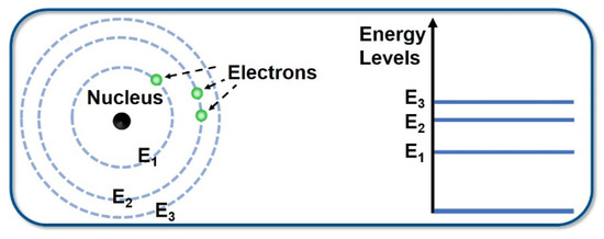 According to the Bohr model, atoms are made up of nuclei and extranuclear electrons, and the orbital radius of the electrons around the nucleus can only be a discrete value. Electrons are in different states when they move in different orbits. Also, atoms have different energies and can only be in a series of discontinuous energy states—these quantized energy values are called energy levels. The energy levels of an atom are also discrete; the lowest energy level is called the ground state and the other energy level is called the excited state (Figure 3). If an electron of an atom jumps from a lower energy level to a higher energy level, it is an absorption process. When the electron jumps from a higher energy level to a lower energy level, it releases a photon with the energy of hν—this is referred to as the emission process. The energy of the photon is equal to the energy difference between the two energy levels, which can be expressed as:
