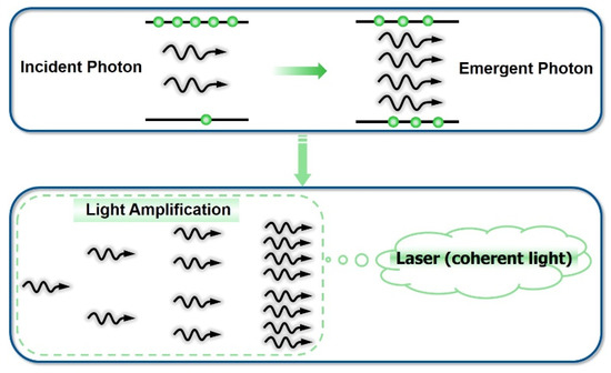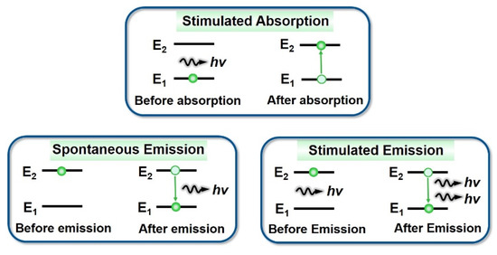 In 1917, Einstein pointed it out that theoretically, in addition to spontaneous radiation, particles on a higher E2 energy level could jump to a lower energy level in another way. An incident photon with a frequency of ν (ν = (E2 − E1)/h) would also cause the particles to rapidly transit from the higher energy level E2 to the lower energy level E1 with a certain probability, and they would radiate a photon with the same frequency, phase, polarization, and propagation direction as the external photon at the same time. This process is called stimulated radiation. At some states, a weaker light can trigger a stronger light—this is called stimulated light amplification, abbreviated as laser [2]. The processes of the stimulated absorption, spontaneous emission, and stimulated emission of atoms are shown in Figure 4.