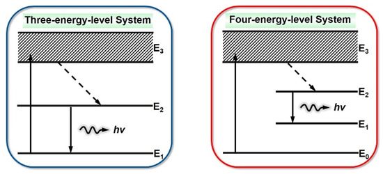 For laser gain media, there exists a special energy level. In this energy state, the atom has a relatively high stability and can easily accumulate excited atoms or other particles, which provides the basic conditions for the realization of particle number inversion. Such energy levels are called metastable energy levels. The materials which can realize particle number inversion between the upper and lower levels can be divided into three-level structures and four-level structures (Figure 5). According to the movement of atoms, the three-energy level system is divided into the ground state, the excited state, and the metastable state. After the laser working substance is motivated, the particle is triggered from the ground state to the excited state and jumps to the metastable state. There it stops for a short time (about 10−3 s) because the life of the excited state is very short (about 10−7 s). With the enhancement of excitation and the passage of time, the number of particles in the metastable state will become greater than the number of particles in the ground state—this state is called the particle number inversion. In the setting of an optical resonator, optical oscillations and the amplification of stimulated radiation can be formed and eventually a laser can be output. In a three-level system, the efficiency of obtaining the particle number inversion between the intermediate energy state and the ground state is not very high. Because the intermediate energy state (i.e., the metastable state) is empty at the beginning of pumping, it is necessary to transfer half of the number of ground state particles to the intermediate state to realize particle number reversion. The four-level energy system can be divided into the ground state, excited state, metastable state, and final state. When the particles are excited, they jump from the lower energy level E0 to the higher energy level E3, and E2 is the upper energy level of the metastable state. The particles excited to E3 are rapidly transferred to the metastable state through non-radiative transition. The particles can accumulate at E2 due to the long metastable life and realize particle number inversion between E2 and E1 [38]. For a four-level system, because the E1 is not the ground level but an excited level, and is basically empty at room temperature, the number of particles in the final state is very small. As long as the number of particles in the metastable state is greater than the number of particles in the final state, particle number inversion can be realized. Therefore, the excitation energy of a four-level system is much smaller than that of a three-level system and can produce a laser far more easily than a three-level system [39,40].