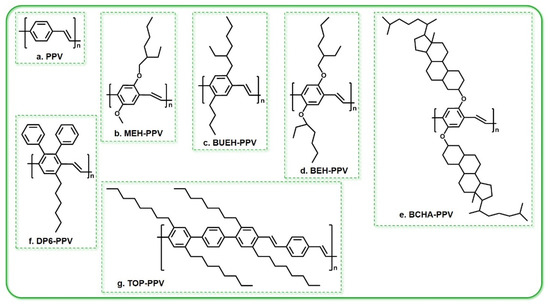 At present, the most extensive and in-depth study of conjugated polymer laser materials has been focused on PPV and its derivatives, which have a relatively high brightness, easy band gap control, and a low threshold for gain narrowing [14]. PPV is a typical linear conjugated polymer material and its derivatives have a higher molecular weight, enabling the formation of a high-quality film. Numerous reports have described the laser emission from PPV and its derivatives with high efficiencies at low pump thresholds. Completely conjugated polymers without substituents are insoluble; however, by introducing flexible side chains such as alkanes (oxygen) to the main chain of PPV, the solubility of the polymer can be increased, the stability of the material can be improved, the length of the conjugate chains can be effectively controlled, the luminescence wavelength of the polymer can be changed, and the quantum efficiency of luminescence can be improved. In addition, the absorption spectrum of PPV is strong and wide, so when excited, a 150 nm thick PPV film can absorb more than 90% of the excited photons. The most studied PPV derivatives are MEH-PPV and BuEH-PPV [49], and others include BEH-PPV, BCHA-PPV [50], TOP-PPV [51], DP6-PPV, and so on. The chemical structures of some PPV derivatives are shown in Figure 7. Holzer et al. studied the properties of various PPV copolymers and PPV derivatives whose hydrogens are substituted on the double bonds. They found that the wavelength could be selected or modulated by adjusting the properties of the substituent groups and the content of the copolymers [51].