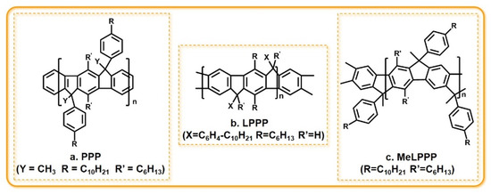 The derivatives of p-phenylene (PPP) are all conjugated polymers that emit blue light (Figure 8). Their stimulated emissions in the spectral region from 480 to 520 nm do not compete with photoinduced absorption spectra, which make them very appealing as active blue light laser media [52,53]. This kind of material is relatively stable with an energy gap of nearly 3 eV, which meets the requirement of a blue light-emitting material. The first stimulated emission of undoped conjugated polymers was found in methyl-substituted ladder-type poly(p-phenylene) (MeLPPP) [54]. Since then, with the use of new cavity structures (two-dimensional optical crystals, circular gratings, etc.), laser emission in PPP films has been reported frequently.