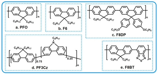 Poly(9,9-dioctylfluorene) (PF) derivatives have rigid planar structures and are easy to introduce into flexible alkyls, with excellent solubility [55]. The structures of common PF derivatives are shown in Figure 9. Generally, they have very high fluorescence quantum efficiencies. In particular, their blue laser emission efficiencies and solid-state fluorescence quantum efficiencies reach up to 60%~80% [56,57,58]. The first report of PF as laser material appeared in 1997. Müller et al. believed that the spectrum line narrowing phenomenon in PFO was the result of the combined action of amplified self-emission and superfluorescence [59]. Lan et al. calculated the excitation parameters of the PFO copolymer, showing that its stimulated emission cross-sectional area at 448 nm was about 1.6 × 10−16 cm2, and its absorption cross-sectional area at 370 nm was about 2.8 × 10−16 cm2. When pumped with 1.4 kW/cm2, the net gain coefficient was 26 ± 1.7 cm−1 and the loss coefficient was 13 ± 1.1 cm−1 at the peak of ASE [60].