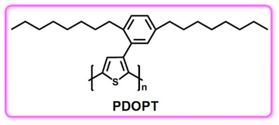 The chemical structure of PDOPT: poly(3-(2,5-dioctylphenyl) thiophene).