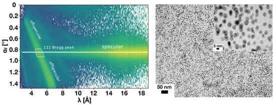 (Left panel): Intensity collected at the detector of Platypus and plotted versus out-of-plane exit beam angles and neutron wavelength. The line of specular intensity as well as the 111 reflection of the fcc structure are indicated. (Right panel): TEM image of the magnetic particles.