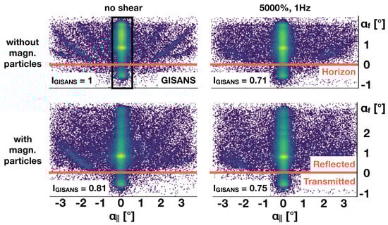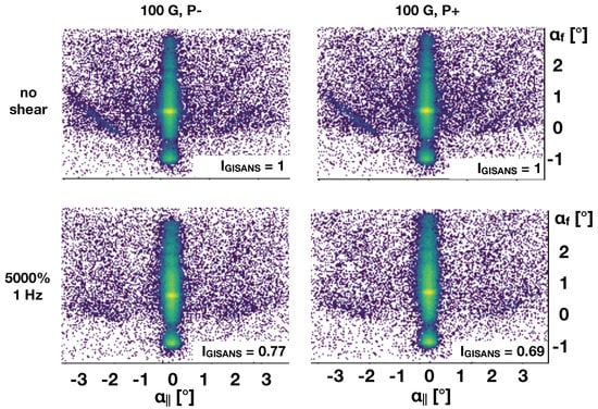 Polarised GISANS images of the F127 solution with magnetic particles taken without (top row) and with oscillatory shear (bottom row). Data taken for the different polarisation directions of the incident neutron beam are shown in the left and right column. Shear smears out the GISANS scattering. The relative GISANS intensities ( given at the bottom right of each panel) were calculated by integrating a detector region with non-zero in-plane scattering angle (i.e., excluding specular/off-specular region) and normalising by the number of frames contributing towards each image.