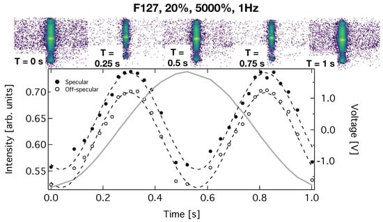The panels on the top depict the GISANS scattering patterns sorted with respect to voltage in the same way as the specular and off-specular intensities. Note: The number of neutron frames for a certain voltage interval differs, since the exposure time of the sample in the interval differs. We account for this fact by normalising the scattering patterns with respect to the number of frames in an interval. It turns out that the GISANS intensity integrated over the detector, excluding areas close to , is constant over time (see blue data points in the lower panels of Figure 6). However, the GISANS scattering patterns shown in Figure 5 seem to show an intensity variation, which is exactly opposite to the one extracted from the specular and off-specular scattering data. This change in apparent count rate is an effect of the low GISANS signal. For longer exposure times, when the derivative of voltage with respect to time is small, the background on the detector becomes more homogenous, since detector pixels with zero counts show up white in the panels whereas those with at least one count become purple. This leaves the impression of an enhanced GISANS signal for voltage intervals with longer exposure times. In other words the panels on the top panel of Figure 5 depict the GISANS scattering patterns corresponding to different voltages (spindle speeds), in a similar manner to the specular and off-specular intensity variation. While the GISANS images appear to show significant variation in GISANS intensity across the waveform, the integrated GISANS scattering rates show no voltage dependent variation, and the apparent differences are caused by some images being composed of a much larger number of frames than the others. A detailed time dependent analysis would require much longer exposure times. Typically, a GISANS image may take on the order of one hour. Considering the 30 time intervals in our study this would relate to more than one day of measurement but is not a limitation since stronger scattering or more brilliant sources could be used. Still our evaluation of the data clearly shows the capability to evaluate time dependent GISANS scattering patterns with a time resolution below one second.