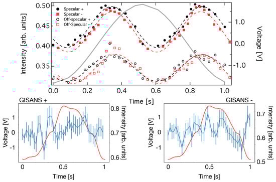 Neutron intensity plotted versus time during one period of oscillation. (Upper panel): The closed symbols represent intensity integrated over the specular region indicated by the polygon in Figure 2 and normalising by the number of frames contributing towards each image. The black and red color indicates scattering for + and − polarised incident neutrons. The open symbols represent the off-specular scattering extracted in the same way but integrating over the Bragg sheet visible as green diagonal region of increased intensity in Figure 2. (Lower panels): GISANSsignal calculated by integrating a detector region with non-zero in-plane scattering angle (i.e., excluding specular/off-specular region) and normalising by the number of frames contributing towards each image and plotted versus time. The left and right panels show data for + and − polarised incident neutrons, respectively. The solid red line is the output voltage of the rheometer.