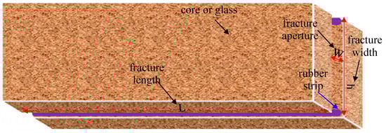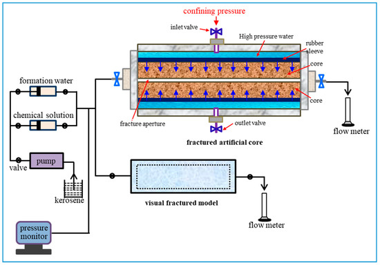 The visual fractured model with a length of 30 cm and a width of 4.5 cm was made by using epoxy resin adhesive to cement two pieces of single frosted glass with two thin rubber strips between them along the sides. During displacement, the image was obtained using a CCD camera at any time. The fractured artificial core was made by fracturing an artificial core with a water permeability of 10 × 10−3 μm2 along the injection direction from the middle part, and then two thin rubber strips were filled in the fractures along the two sides. The two thin rubber strips had the same size with a thickness of 2 mm. The fractured artificial core model is shown in Figure 1. The total pore volume of a whole fractured core (TPV) consists of the volume of the fracture (FPV) and the pore volume of the matrix (MPV). 1 MPV is 90 cm3, 1 FPV is 30 cm3, and 1 TPV is 120 cm3. The simulation experiment device for displacement is shown in Figure 2. A special core gripper was applied for continuous and uninterrupted computed tomography (CT) scanning, which was obtained from Jiangsu Huaan Scientific Research Devices Co., Ltd in Jiangsu, China. In the experiment, the confining pressure was fixed at 5 MPa to seal the fractured core. Due to the weak compressible, the change of the thickness of rubber under the pressure of 5 MPa was ignored. Besides, as the outlet is directly connected to the atmosphere, the injection pressure of a fluid is equal to its flow resistance across the fractured model.