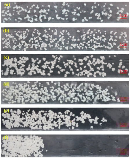 Distribution of the gel particles in the fracture in the condition with different injection schemes ((a): injection concentration of 500 mg/L and injection rate of 20 mL/min; (b): injection concentration of 1000 mg/L and injection rate of 10 mL/min; (c): injection concentration of 2000 mg/L and injection rate of 5 mL/min; (d): injection concentration of 5000 mg/L and injection rate of 2 mL/min; (e): injection concentration of 10,000 mg/L and injection rate of 1 mL/min; (f): injection concentration of 20,000 mg/L and injection rate of 0.5 mL/min).