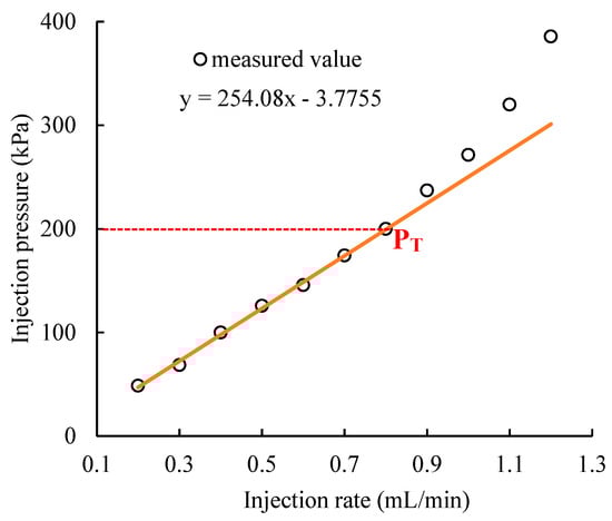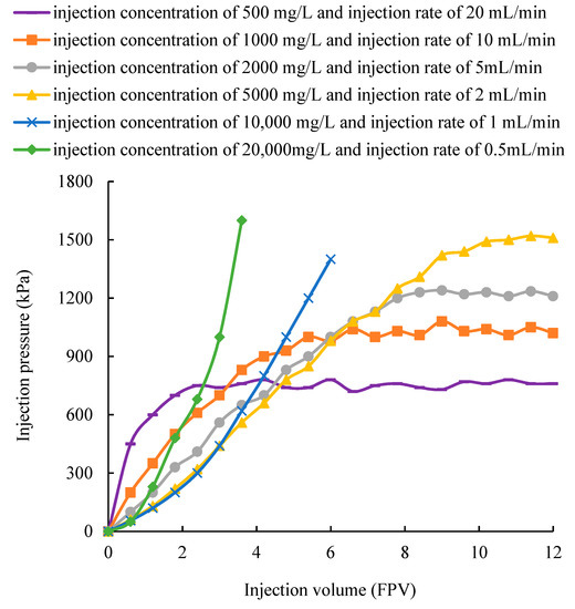 The changes in injection pressure with the injection rate are shown in Figure 9, which show that the linear relationship between the injection pressure and injection rate is changed when the injection pressure is more than 200 kPa and the injection rate is more than 0.8 mL/min. Beyond this range, gel particles can be pushed. Therefore, the PT is 200 kPa and the permeability of the gel particles media is 8050 × 10−3 μm2 in the linear region according to Darcy’s formula.