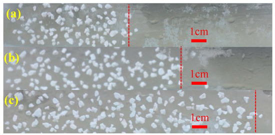 According to the results in Section 3.1, the gel particles with a size of 3.6 mm were selected and then injected into the fracture. Its distribution and flow resistance in the fracture under the same mass flow rate and different injection schemes are shown in Figure 5 and Figure 6, respectively. Figure 5a shows that a low concentration and a high flow rate can produce a high flushing action on the gel particles, so that the gel particles can smoothly pass through the fracture and its distribution in the fracture is scattered. In addition, due to a high flow rate, the injection pressure is rapidly increased at the early stage, but is kept at a low level at the later stable stage, such as the curve under an injection concentration of 500 mg/L and an injection rate of 20 mL/min in Figure 6. This can lead to a poor plugging effect. When the concentration and flow rate are both moderate, the gel particles can densely cover the whole fracture, which is shown in Figure 5b–d. Correspondingly, the injection pressure is gradually and steadily increased and can maintain a high value at the stable stage, such as the curve under an injection concentration of 1000 mg/L and an injection rate of 10 mL/min, an injection concentration of 2000 mg/L and an injection rate of 5 mL/min, and an injection concentration of 5000 mg/L and an injection rate of 2 mL/min in Figure 6. By further comparison, we can conclude that the injection volume of gel particles is the largest and the injection pressure is the highest under an injection concentration of 5000 mg/L and an injection rate of 2 mL/min, which is advantageous for plugging the whole fracture. As the concentration is further increased and the injection rate is further reduced, the distribution of gel particles in the fracture becomes more compact and tight until the accumulation occurs at the inlet and causes a sharp increase in the pressure, as shown in Figure 5e,f, and the curve under an injection concentration of 10,000 mg/L and an injection rate of 1 mL/min, and an injection concentration of 20,000 mg/L and an injection rate of 0.5 mL/min in Figure 6. After comprehensive analysis, it is concluded that an injection concentration of 5000 mg/L and an injection rate of 2 mL/min is optimal for plugging.