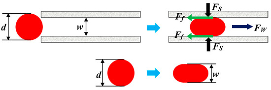 When a gel particle is transported and deformed in the fracture under the action of water flow and the wall of the fracture, its shape can be taken as a spherical shape under ideal conditions, which is shown in Figure 8. When it is compressed, the particle contacts with the wall surface of the fracture by surface contact rather than point contact. Therefore, the gel particle is subjected to three forces, which are the pressure of the wall surface of the fracture on the gel particles (FS), the frictional resistance of the gel particle moving forward (Ff), and the water flow flushing force (Fw), respectively [32].