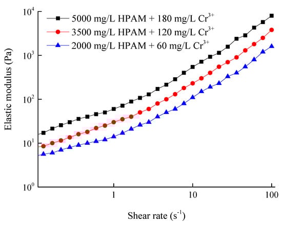 Relationship of the elastic modulus and the shear rate of the three gels.