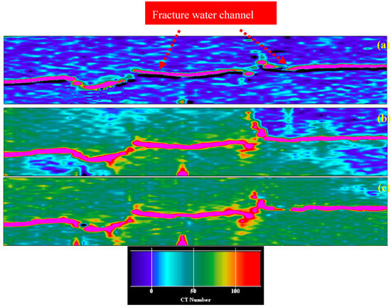 Based on the above results, 10 FPV of the gel particles solution with a concentration of 5000 mg/L was first injected into the fractured core at an injection rate of 2 mL/min, and then water flooding was carried out until the water cut was increased to 98%. Secondly, 12 cm3 (1GPV) of the HPAM/Cr3+ system (3500 mg/L HPAM + 120 mg/L Cr3+) was subsequently injected into the fractured core at an injection rate of 0.04 mL/min. After gelation of the HPAM/Cr3+ system, water flooding was carried out again until the water cut was increased to 98%. Thus, the characteristics of the changes in the swept volume by water flooding before and after plugging using polymer gel assistance to the gel particles was obtained through CT scanning, which are shown in Figure 11. The blue region is the oil, the red region is the fracture channel, and the green region is water. Figure 11a shows that the injected water basically flows in the fracture channel and the oil in the matrix was not swept and displaced. Figure 11b shows that the fracture was plugged by the gel particles, and the swept volume increased to a certain extent. However, there are still some areas that were swept. This shows that the heterogeneity of the fractured core plugged by gel particles needs to be further improved. Thus, the HPAM/Cr3+ system was injected into the gel particles and the blue region was further reduced and the green region was further increased, which is shown in Figure 11c. We can conclude that when a suitable HPAM/Cr3+ system is applied based on the optimization of the injection parameters of gel particles, the oil in the matrix can be almost completely swept during water flooding.