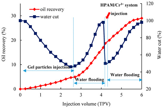 Characteristics of the oil recovery in the fractured core during the gel particles injection, water flooding, HPAM/Cr3+ system injection, and subsequent water flooding.