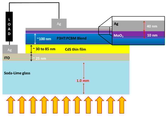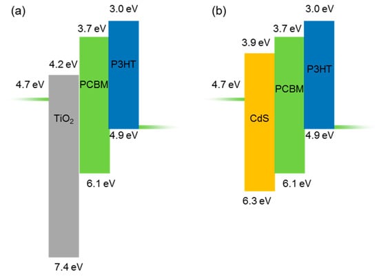- Thanihaichelvan, M.; Sockiah, K.; Balashangar, K.; Ravirajan, P. Cadmium sulfide interface layer for improving the performance of titanium dioxide/poly (3-hexylthiophene) solar cells by extending the spectral response. J. Mater. Sci. Mater. Electron. 2015, 26, 3558–3563. [Google Scholar] [CrossRef]
